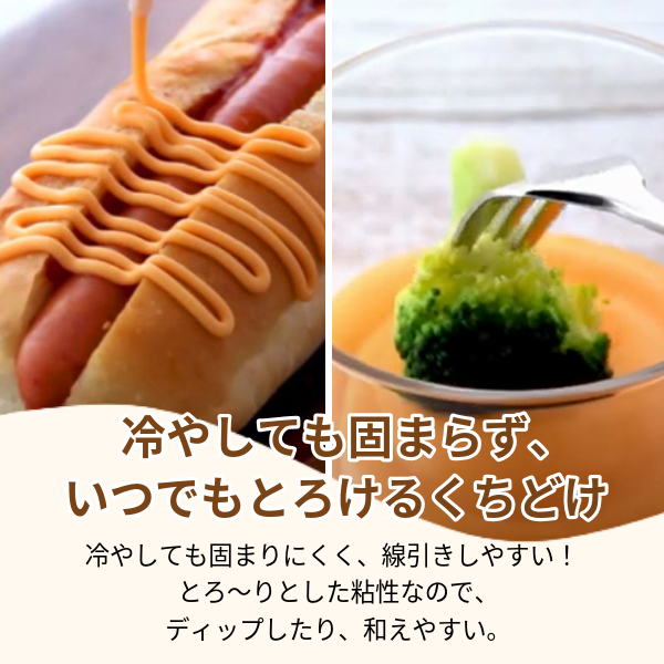 - コクのあるクリームチーズと風味豊かなチェダーチーズをあわせた、濃厚な味わいです。冷めても固まらず、いつでもなめらかな状態でご利用いただけます。ナチョスやホットドッグの他、ポテトサラダなどにもどうぞ。細口キャップのチューブボトルで線引きも簡単にできます。