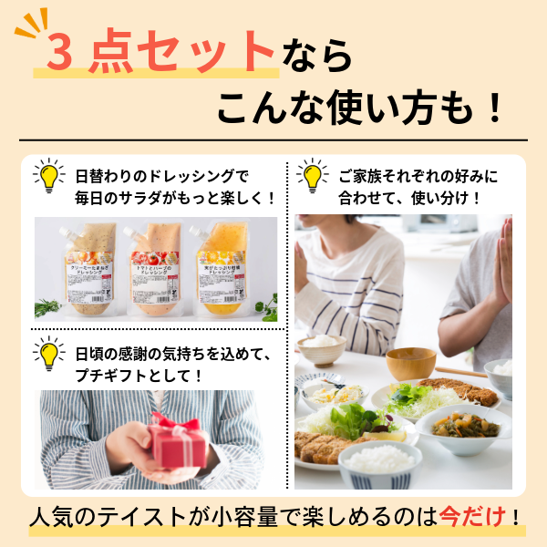 当社のこだわりが詰まった3種類のドレッシングを、ご家庭で使いやすい小容量サイズでご用意しました。