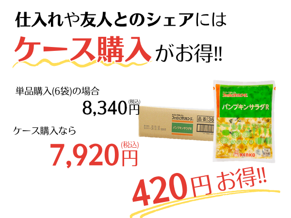 - ゴロゴロとしたかぼちゃをクリーミーな専用ソースで合わせました。食べ応えがあり、甘味のあるかぼちゃが幅広い層に人気のサラダです。ケースでのご購入は、単品購入よりも5%お買い得です。