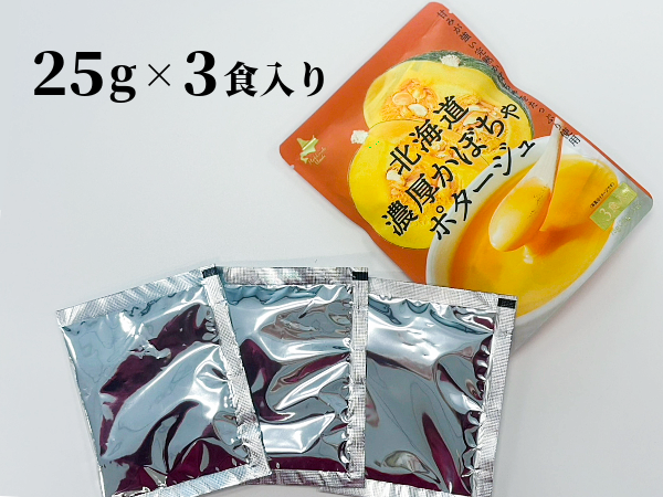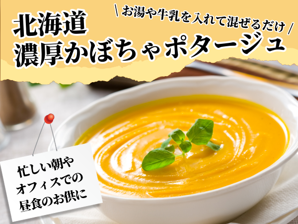 - 北海道産の完熟かぼちゃをたっぷり使用したかぼちゃポタージュです。お湯や温めた牛乳を注いで混ぜるだけで、濃厚