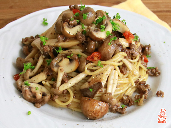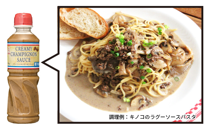 マッシュルーム(仏名シャンピニオン)などを使用したフランス生まれの調味料「デュクセル」をイメージした、クリーミーで濃厚なソースです。きのこ類の香りや旨味をきかせた奥行きのある味わいが特長で、ゆでたパスタに絡めるだけで香り高い一品に仕上がります。