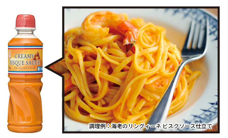 海老などの甲殻類を使用したフランス生まれのスープ「ビスク」をイメージしたクリーミーで濃厚なソースです。 トマトやオマール海老の芳醇で華やかな味わいが特長で、ゆでたパスタに絡めるだけでリッチな一品に仕上がります。
