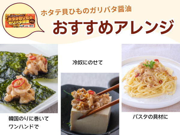 ホタテ貝ひもを美味しくアップサイクル!宮城県産のホタテ貝ひもを、芳醇な香りがたまらないガーリックバター(ガリバタ)と醤油で、こってり満足度の高い味わいに仕上げました。電子レンジ加熱が可能なので、温めてそのままご飯のおかずやおつまみに。さらに炒飯やパスタの具材にもアレンジできて、料理の幅も広がります。