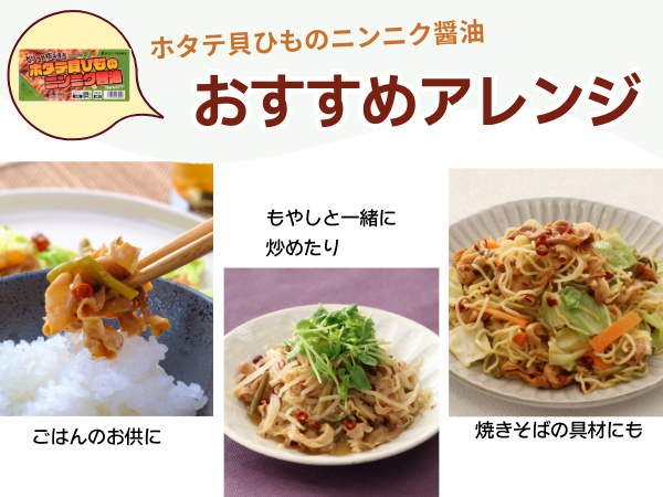 ホタテ貝ひもを美味しくアップサイクル!宮城県産のホタテ貝ひもを、炒めたにんにくとラー油をきかせたパンチのあるにんにく醤油で、ガツンとやみつきテイストに仕上げました。電子レンジ加熱が可能なので、温めてそのままご飯のおかずやおつまみに。さらに、もやしと和えたり、焼きそばの具材としても使えて、料理の幅が広がります。