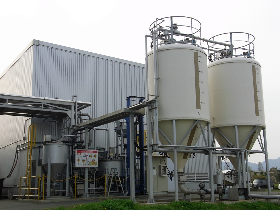 ポテトサラダの製造工程で出たばれいしょの皮「ポテトピール」を、敷地内にある飼料製造プラントにて液状化し、豚の飼料などに活用しています。これは農林水産省の認定事業として施設整備を行い、2009年に導入した国内初の取組みです。