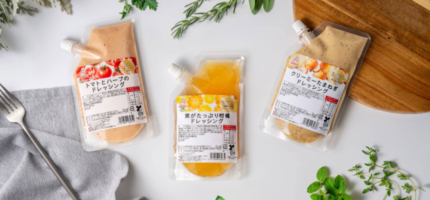 業務用で人気のドレッシングを使いやすい200mlサイズにしました。容器は冷蔵庫内で場所を取らず、ボトルに比べてプラスチックの使用量が少ないスパウトパウチを利用し、ラベルのインクもバイオマスインキを使い環境にも配慮しました。使いやすく、環境にも優しいスパウトパウチのドレッシングです。